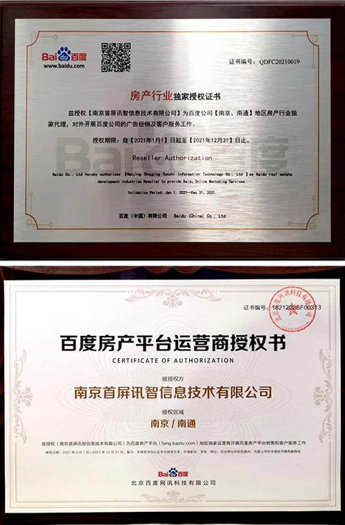 會(huì)上,百度公司正式授權(quán)南京首屏訊智信息技術(shù)有限公司為南京、南通地區(qū)房產(chǎn)行業(yè)獨(dú)家代理商及百度房產(chǎn)平臺南京、南通地區(qū)獨(dú)家運(yùn)營商,并頒發(fā)授權(quán)證書。首屏訊智自2004年成為百度合作伙伴,始終致力于為廣大企業(yè)提供優(yōu)質(zhì)的互聯(lián)網(wǎng)營銷服務(wù)。擁有17年豐富互聯(lián)網(wǎng)行業(yè)服務(wù)經(jīng)驗(yàn)的首屏訊智,已服務(wù)南京企業(yè)2萬余家,助力廣大企業(yè)快速穩(wěn)健發(fā)展。